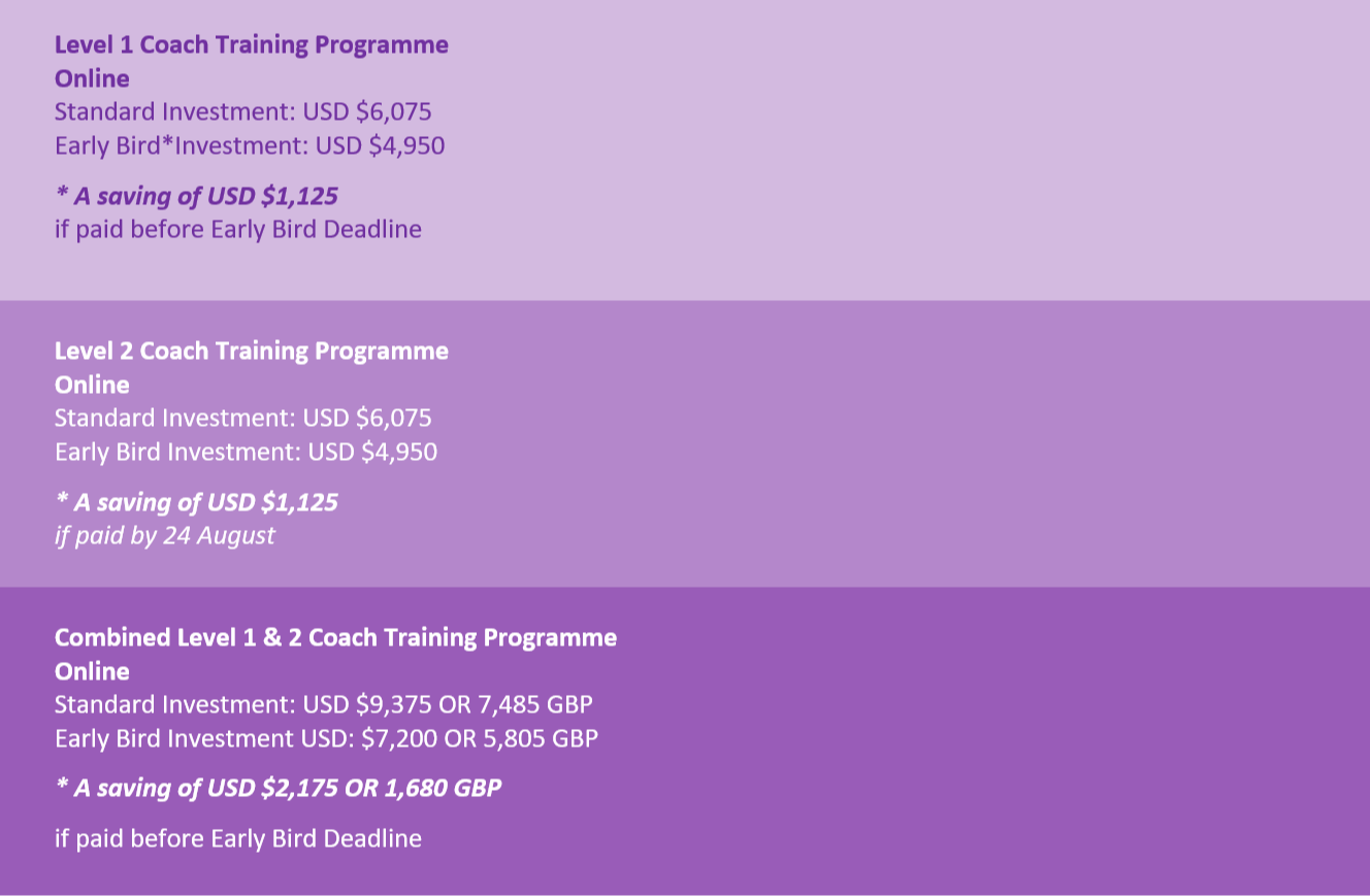 âś“ The knowledge, information, practice, experience of coaching and feedback to set you up as a professional coach in training to achieve your credential